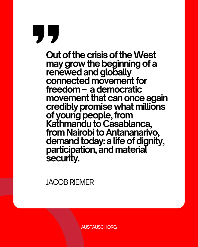 Out of the crisis of the West may grow the beginning of a renewed and globally connected movement for freedom – a democratic movement that can once again credibly promise what millions of young people, from Kathmandu to Casablanca, from Nairobi to Antananarivo, demand today: a life of dignity, participation, and material security.