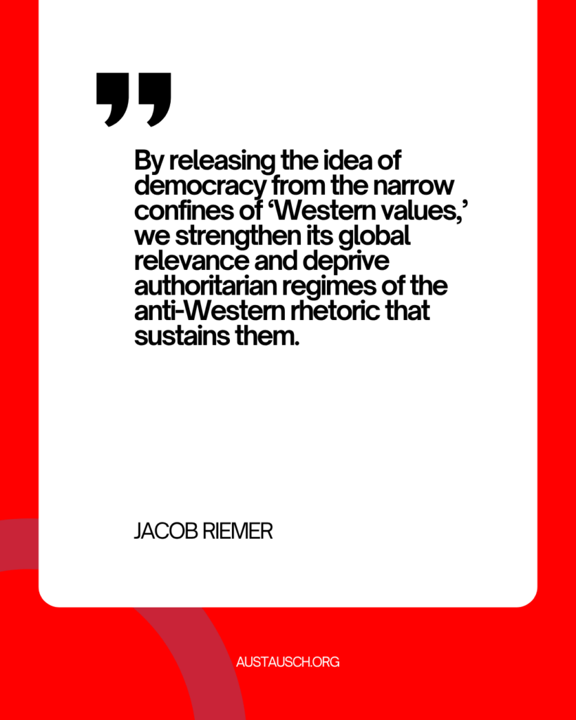 Therein lies strategic wisdom. By releasing the idea of democracy from the narrow confines of “Western values,” we strengthen its global relevance and deprive authoritarian regimes of the anti-Western rhetoric that sustains them. A radically plural understanding of democracy opens new spaces for cooperation – without denying cultural identity. In doing so, it dismantles the ideology of so called “traditional values,” which negates local cultures of freedom to justify authoritarian rule.