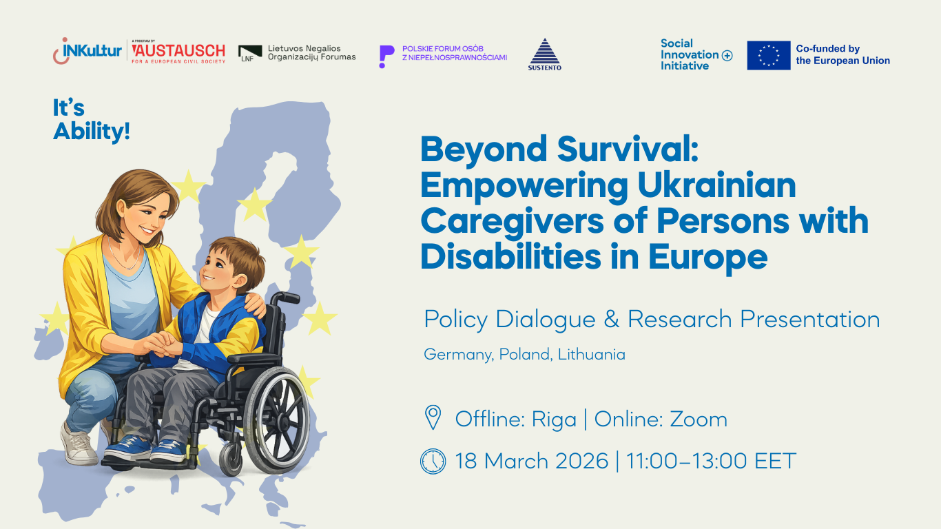 Within the framework of the project “It’s Ability!” we will present the results of a new international research study: “Invisible Care, Unmet Needs: The Situation of Ukrainian Caregivers of Persons with Disabilities in the EU.” The research focuses on the experiences of Ukrainian caregivers in Lithuania, Poland, and Germany, bringing together perspectives from caregivers themselves as well as insights from experts, practitioners, and organisations working with these communities.